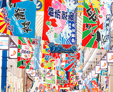 若說起明石鯛魚和明石章魚就要提魚之棚。白天競拍到的鮮魚和乾貨當然不用說,當場品嚐明石燒和加工品等美食也非常豐富。明石品牌的食材琳瑯滿目,熱鬧的商店街。