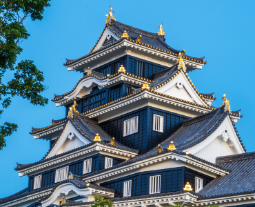 這座城堡是由豐臣秀吉的家臣、豐臣五老之一的浮多秀家建造的。這座三層至六層的天守閣,造型為罕見的不等邊五邊形,外觀氣勢宏偉,其黑色隔板外牆為其贏得了“烏鴉Ujo (烏城)”的綽號。從最上可以俯瞰旭川,並欣賞岡山後樂園和城市的 360 度全景。原來的天守閣在 1945 年(昭和20 年)的空襲中被摧毀,但後來重建,領主的房間和其他區域也得到了修復。一樓設有備前備前燒工坊,可體驗。此外,每年春、夏、秋季,岡山城守閣及其周邊都會舉行亮燈烏城燈源鄉」。