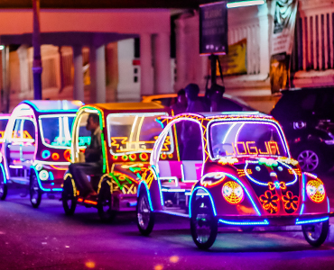 【夜市馬利歐波羅街+復古三輪摩托車】安排參觀最熱鬧的日惹有名的Malioboro街市集,尤其多做觀光客生意的小工藝品攤子。Maliboro街是一條商業化的街,這兒販賣許多當地的食物和手信品,也有許多遊客趨之若騖的蠟染藝術品,是所有觀光客必造訪的街道。
