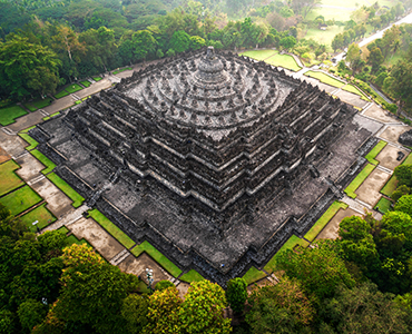 婆羅浮屠 Borobudur,被譽為世界上最大的單一佛塔,金字塔形狀並有約2672塊浮雕和504尊佛像,建於8~9世紀的夏連特拉王朝。15世紀因爪哇人轉信奉伊斯蘭教而被遺棄,19世紀英國統治時期,考古學家在叢林中重新發現了這座被遺棄的佛寺,並廣為讓外界知曉,後來被列為聯合國教科文組織世界遺產。入寺需換上他們所提供的編織拖鞋,您可帶走它做為紀念。