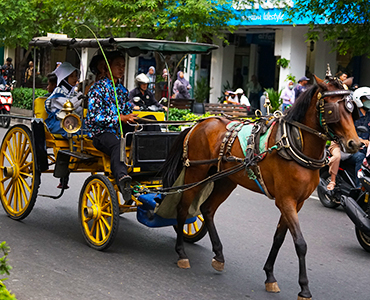 【人力三輪車】 逛日惹城,三輪車是最佳交通工具,沿途可看到最熱鬧的晚間夜市尤其是做觀光客生意的小工藝品攤子,亦可盡情欣赏文化古城裡的建築和街道上隨處可見的精美的浮雕和雕像。