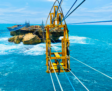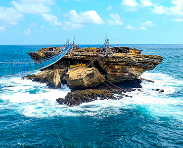【蒂芒海灘】位於印尼日惹基杜爾山(Gunung Kidul),是一處以驚險刺激著稱的小眾景點。其特色為壯麗的海崖地形、洶湧的巨浪,以及連接岸邊與蒂芒島的傳統手拉纜車(Gondola)和懸索橋。遊客可體驗驚險的高空跨海纜車、享用新鮮的海鮮,並在此欣賞震撼的海岸風光。