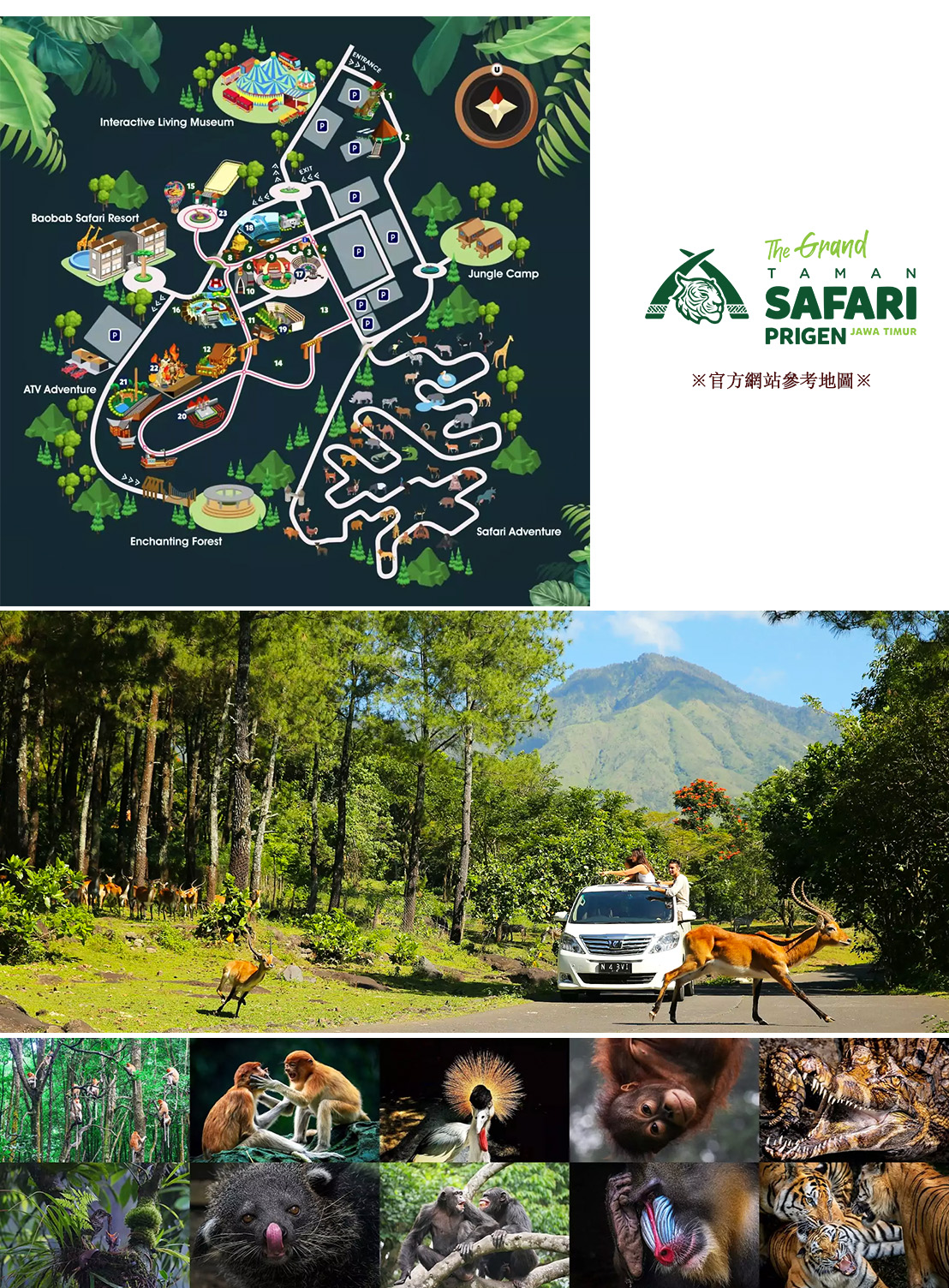 印尼普里根野生動物園,是東爪哇最大的動物園。搭乘導覽車穿越自然棲息地觀察獅子、老虎等動物。另外提供親手餵食長頸鹿等互動體驗,是熱門的家庭旅遊勝地。