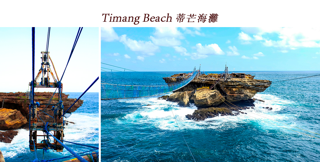 蒂芒海灘 Timang Beach,以驚險刺激的「手工拉式纜車」跨越洶湧海浪而聞名,是《Running Man》取景地。這裡擁有壯觀的海岸懸崖和原始自然風光,可體驗橫跨岩島的快感!